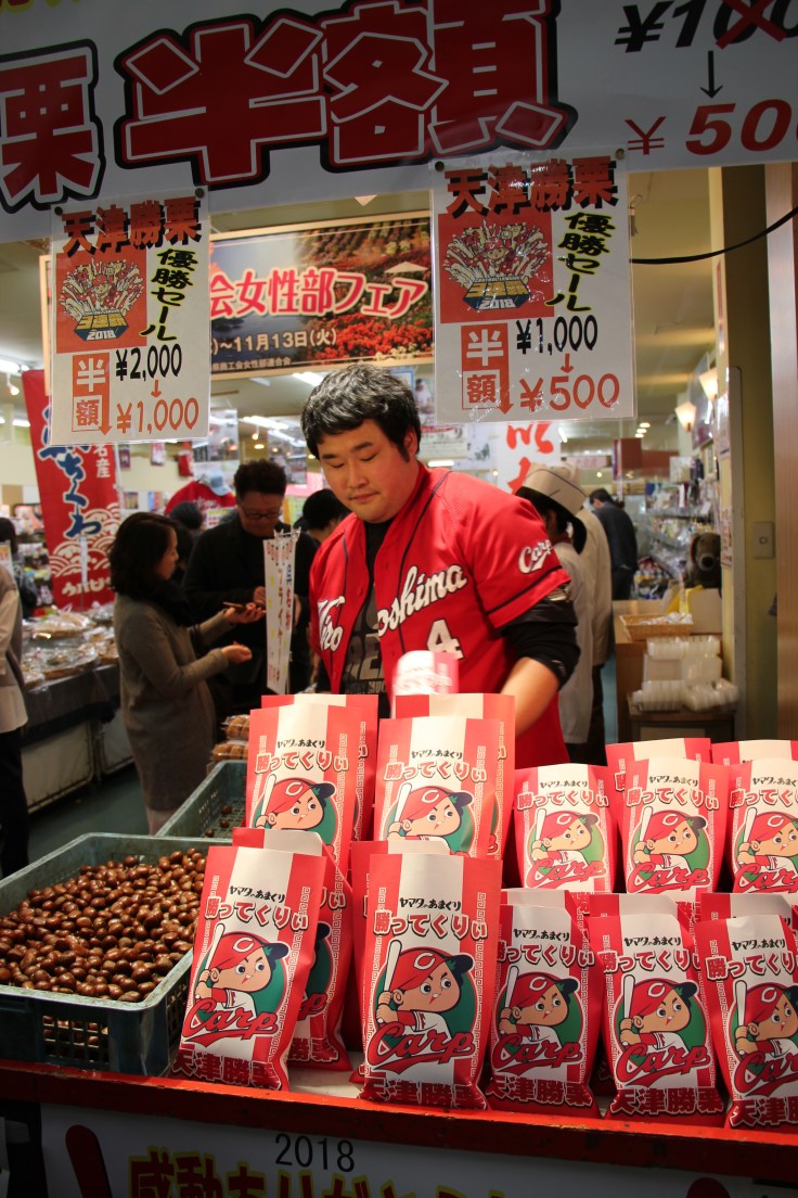 Nous sommes ensuite allés nous promener dans la ville, les rues commerçantes sont nombreuses, et nous avons pu goûter à quelques petites douceurs comme des châtaignes grillés ou encore des mochi, spécialités japonais à base de riz gluant agrémenté de sésame ou de pâte de haricot rouge par exemple. Nous avons aussi remarqué que l’équipe de baseball locale, les Carps, est très populaire et que l’on peut acheter toutes sortes de choses à son effigie !