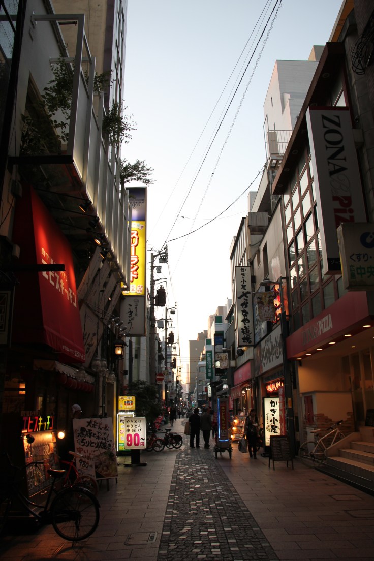 Le soir, nous avons mangé dans un restaurant d’okonomiyaki, spécialité locale, composé de plusieurs ingrédients au choix, souvent de la viande porc et des légumes, avec une pâte faite de choux et d’œuf. On mélange bien le tout et on en fait des portions que l’on cuit sur une plaque chauffante, et on arrose de sauce soja. Il y a plusieurs variantes, végétarienne ou aux crevettes par exemple, et c’est excellent ! Dans la version d’Hiroshima, on ajoute une couche de pâtes, udon ou soba.
