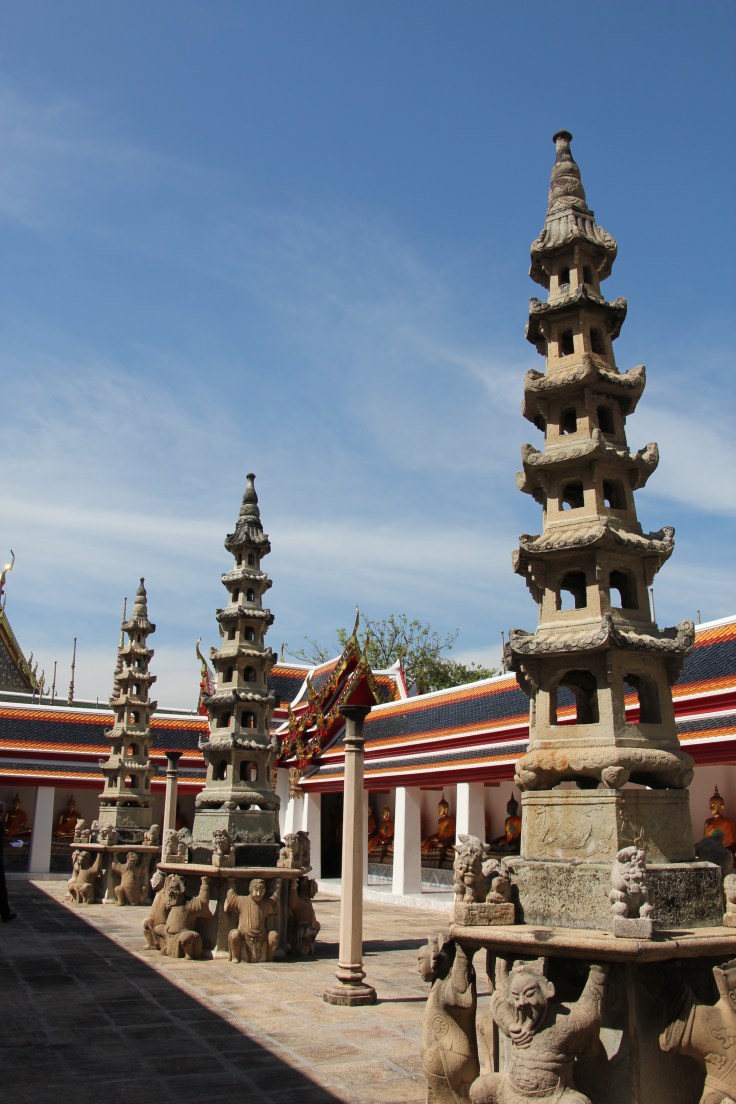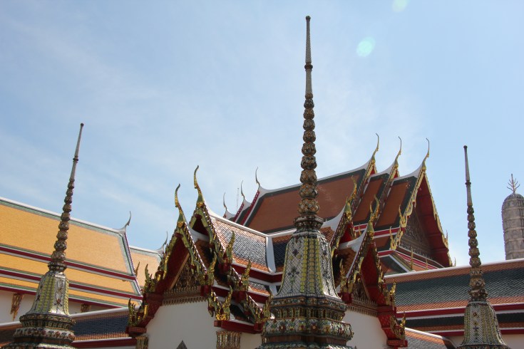 Pour ce qui est des temples, il y a l’embarras du choix ! Nous avons décidé de n’en visiter qu’un seul, soigneusement choisi, le Wat Pho. Il s’agit d’un des plus gros et des plus connus de Bangkok, car c’est là que ce trouve le fameux Bouddha couché géant. Celui-ci est particulièrement impressionnant, il mesure 15 mètres de haut et 46 mètres de large, dans un abri à peine plus grand qui laisse difficilement les nombreux visiteurs circuler autour. L’image du bouddha couché est importante pour le bouddhisme, elle représente Bouddha sur son lit de mort, lors de son passage au nirvana. Il est conçu d’une base en brique, il a ensuite été modelé en plâtre, puis entièrement recouvert d’or. Ses pieds son incrustés de nacres qui représentent les 108 états de Bouddha.