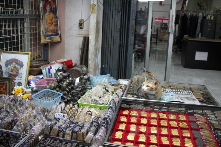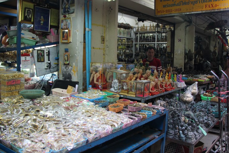 Parmi les nombreux marchés auxquels on peut aller à Bangkok, nous avons choisi d’en faire un plutôt original, le marché aux amulettes. Celui-ci est un des plus importants d’Asie et montre l’importance des amulettes dans les croyances et les superstitions des thaïlandais, qui en possèdent tous au moins une. Elles protègent des mauvais esprits et portent chance, et peuvent avoir différentes actions plus précises comme agir sur la fertilité ou protéger des accidents. Les vendeurs sont nombreux derrière leurs petites tables remplies d’amulettes, ou pieds par terre et du monde vient chiner la pièce rare et scruter les étals avec une loupe. Il ne faut pas hésiter à s’enfoncer dans les allées minuscules pour voir les marchands cachés et découvrir toutes sortes de bijoux, pierres et grigris à l’effigie de divinités. Cependant, le marché serait en danger à cause des professionnels qui s’installent dans les centres commerciaux tout neufs et agissent négativement sur la fréquentation du marché aux amulettes.