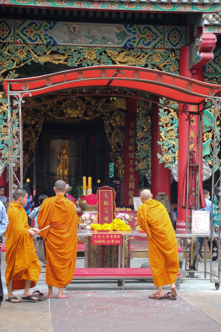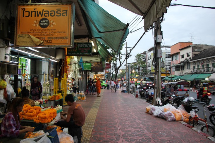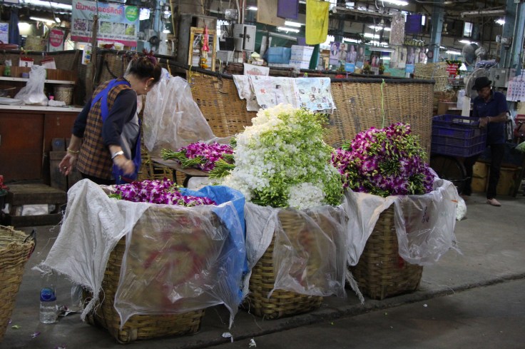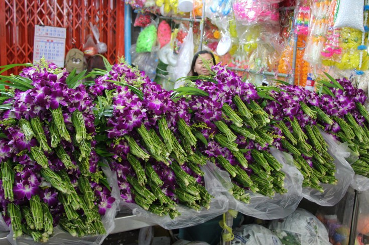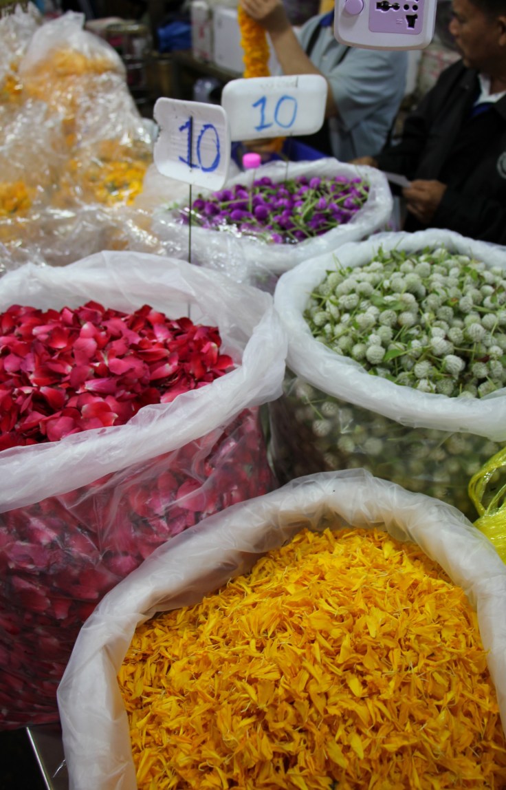 Nous sommes aussi allés voir le marché aux fleurs de Bangkok, véritable coup de cœur ! Le Pak Khlong Talat, ouvert 24h/24, se situe dans la vieille ville et proche du quartier de Chinatown. On peut y trouver toute sorte de fleurs fraiches, livrées quelques heures plus tôt, entre minuit et l’aube, ce qui garantie une odeur incroyable dans tout le marché. C’est aussi ici que l’on fabrique les offrandes qui seront amenées dans les temps, comme les colliers d’œillets jaunes et des compositions florales.