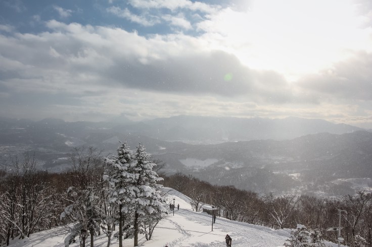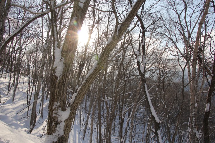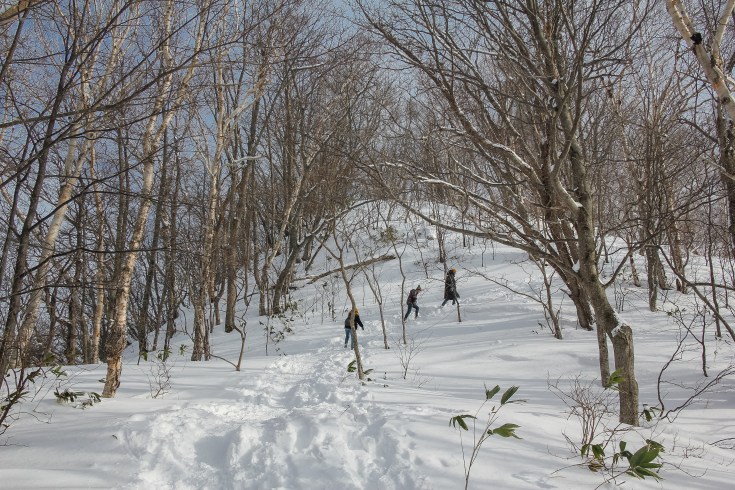 L’activité que nous avons trouvé la plus sympa a été de monter en haut du Mont Moiwa. La plupart des touristes suivent les indications des guides qui expliquent qu’on y monte grâce à un téléphérique. Mais ce qu’ils ne disent pas, c’est qu’on peut aussi monter à pieds, par un chemin enneigé bien plus joli que les télécabines. Nous avons croisé pratiquement que des japonais faisant leur balade en raquettes du weekend.